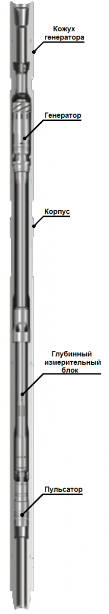 Генератор предназначен для выработки электроэнергии для питания скважинного прибора. Представляет собой однофазный источник питания переменного тока, маслонаполненного типа. Выработка электроэнергии происходит за счет преобразования энергии потока бурового раствора. Генератор не имеет торцевых уплотнений, масло в процессе работы генератора не используется, нет необходимости контролировать и добавлять масло в условиях буровой. Телесистема с гидравлическим каналом связи являются безбатарейными (источник питания – генератор), ресурс до обслуживания 500 ч.