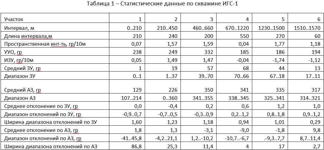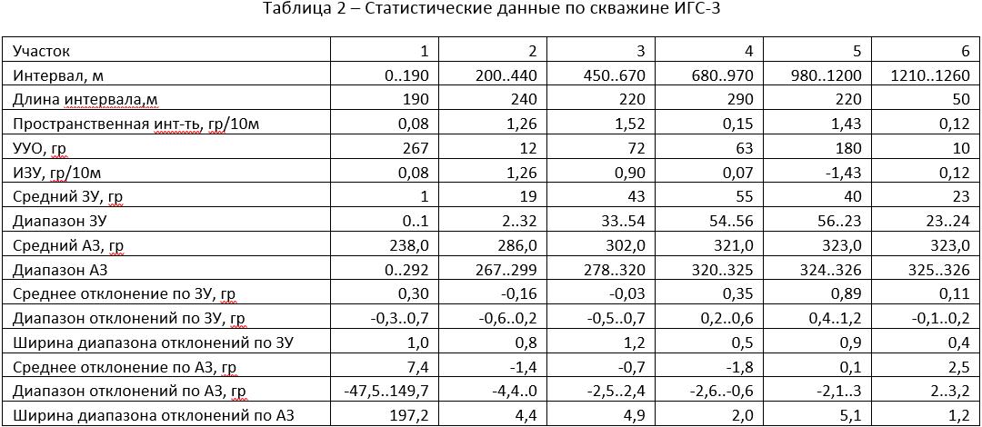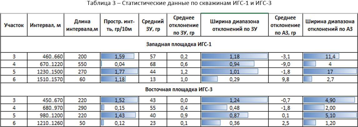 Таким образом, можно кратко обозначить явную тенденцию, характерную для обеих скважин: на участках искривления ствола скважины отклонение по АЗ увеличивается в ту, или иную сторону, на участках стабилизации отклонение по АЗ стабилизируется, как правило в верхнем пределе накопленной погрешности. Данная тенденция визуально представлена в таблице 3 – наблюдается хорошая корреляция между пространственными интенсивностями участков и шириной диапазонов отклонения АЗ. Ширина диапазонов отклонения ЗУ также хорошо коррелируется с величиной пространственной интенсивности.